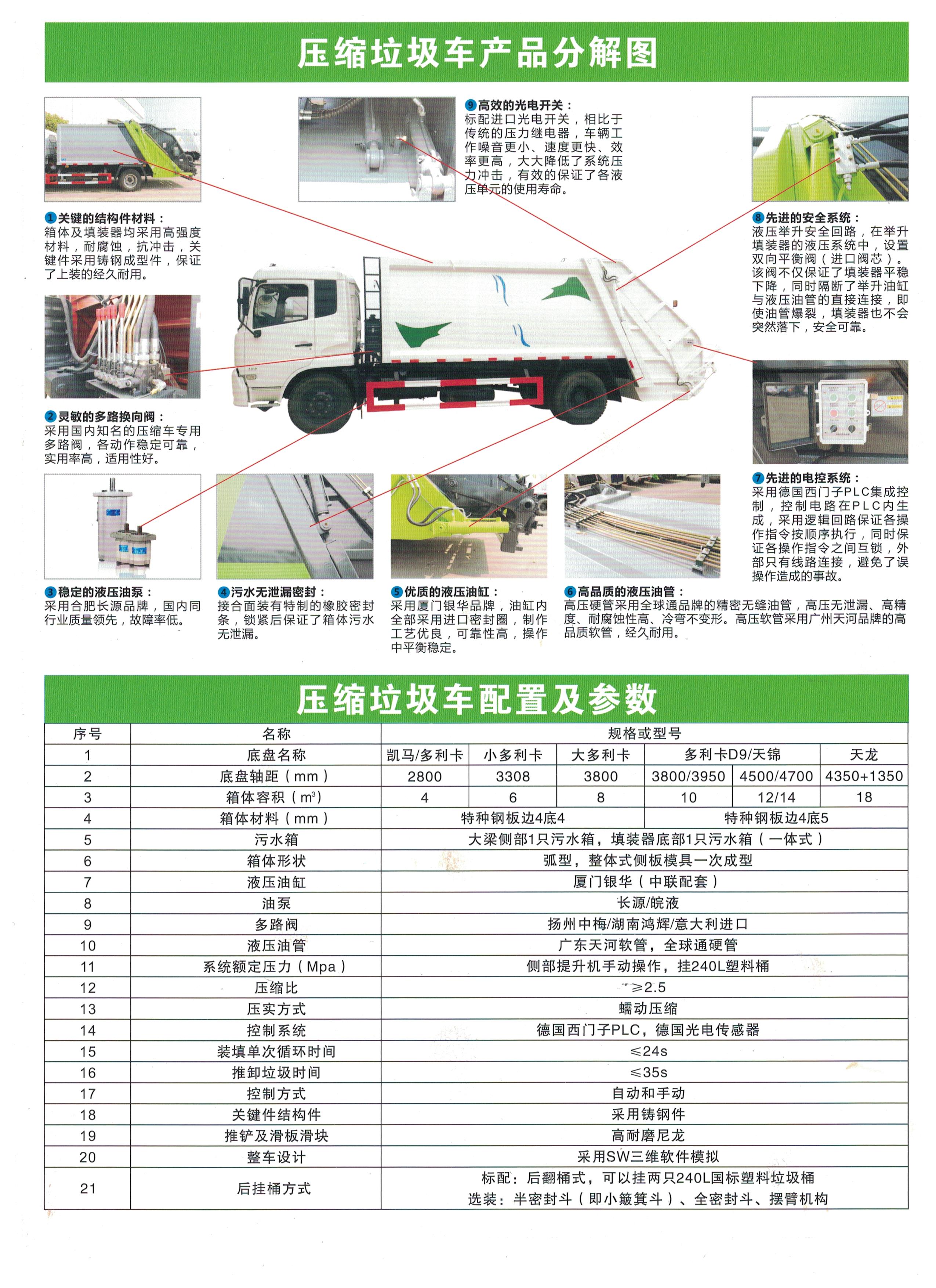 電氣、液壓系統(tǒng)的關(guān)鍵元器件均采用知名元件,如PLC、多路換向閥組、按鈕、油缸密封件等,提高了垃圾車的使用可靠性。
