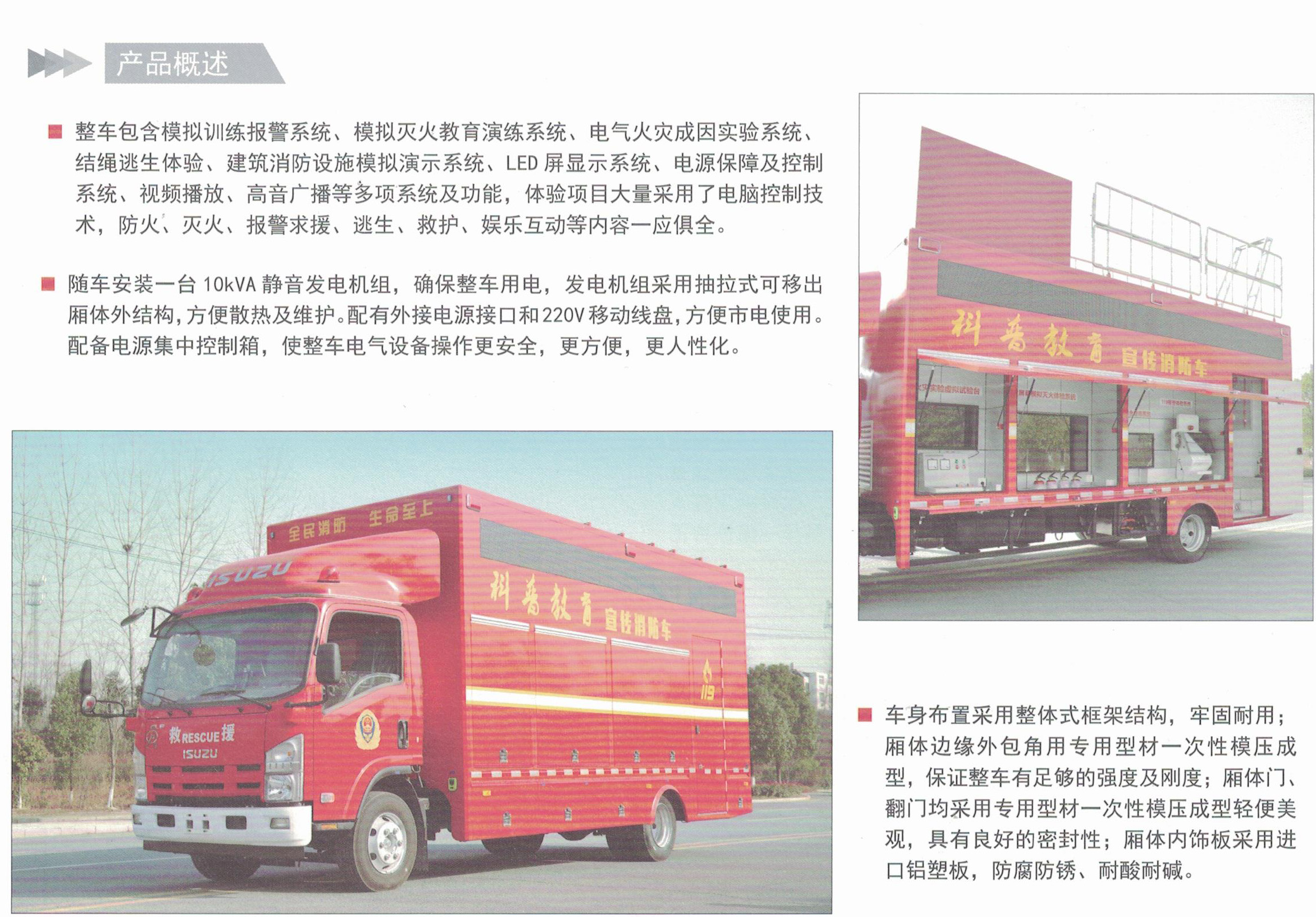 3.3、基本結(jié)構(gòu):車體側(cè)后方安裝一個廂體門,車體頂部安裝一個廂體門,配合煙霧逃生JH通道使用;車體尾部設(shè)置爬梯,供消防員上下車頂;車體前部設(shè)有抽拉式8千瓦發(fā)電機組。側(cè)面安裝P6 LED全彩屏3840mm*1920mm;車廂內(nèi)安裝控制系統(tǒng):臺式電腦,音柱: 2只60W/只 功放:360W;車廂內(nèi)部安裝煙霧逃生通道演練系統(tǒng),爬梯,上部安裝樓層結(jié)繩逃生體驗功能;另側(cè)面安裝模擬報警訓練系統(tǒng)、消防安全標識認知系統(tǒng)、電氣火災成因試驗系統(tǒng)、建筑消防設(shè)施模擬系統(tǒng)、火災隱患查找系統(tǒng)。