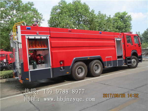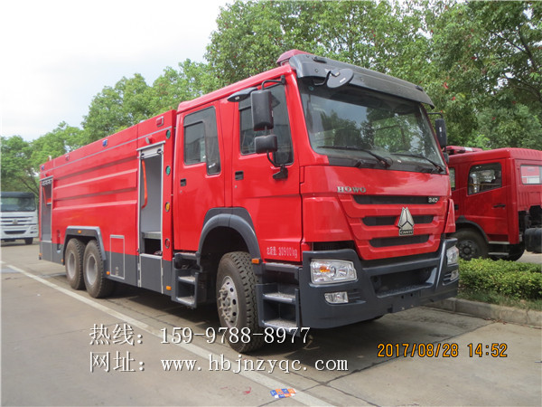 重型15噸泡沫消防車是采用重汽豪沃ZZ5347V4647E1底盤改裝而成,340馬力發(fā)動機(jī),整車由消防員乘員室和車身兩大部分組成,乘員室為單排改雙排,可乘坐2+4人,該車為外露罐結(jié)構(gòu),車身前部為器材箱,中部為水罐,后部為泵房。載液罐體為優(yōu)質(zhì)碳鋼,與底盤采用彈性連接,載水12780kg,泡沫液量2770kg,裝備了上海雄真消防設(shè)備有限公司生產(chǎn)CB20.10/30.60型中低壓消防泵,額定流量60L/S,車頂安裝成都威斯特消防機(jī)械有限公司生產(chǎn)的PL60型車用消防炮。該車最大的特點(diǎn)是載液量大、操控性好、維修簡便。