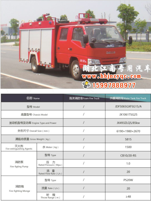 | 產(chǎn)品名稱: | JDF5065GXFSG15/A型水罐消防車 | 外型尺寸(mm): | 6190×1980×2670 |