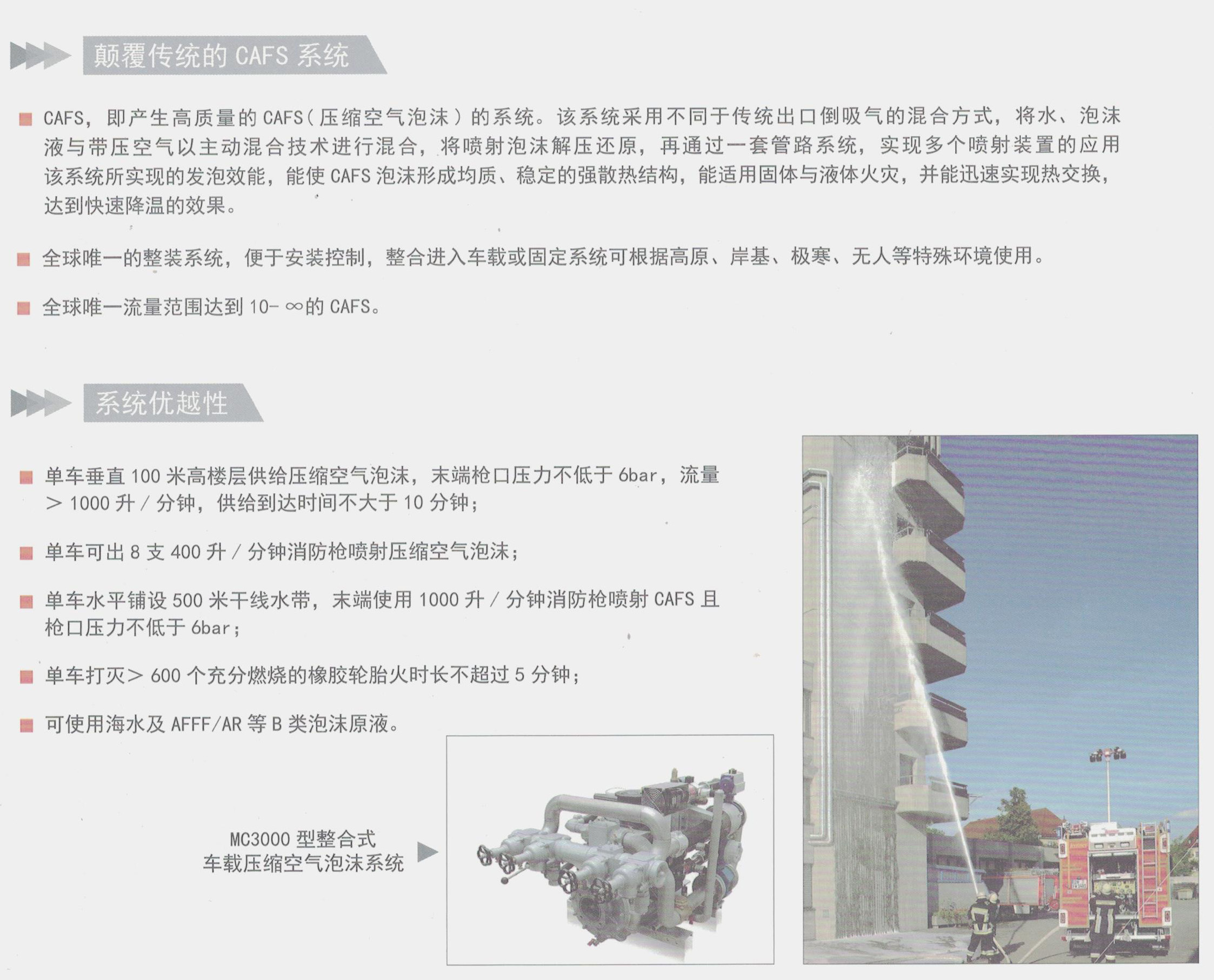1. 江特壓縮空氣泡沫消防車,采用德國曼TGS41.480底盤改裝而成。整車由駕駛室和車身兩大部分組成,駕駛室為單排駕駛室,可乘坐2人,該車為外漏罐結構,車身前部為器材箱,中部為泡沫罐和水罐,后部為泵房。載液罐體為304不銹鋼,內(nèi)部噴涂環(huán)氧底漆及環(huán)氧瀝青漆,與底盤采用彈性連接,載水12000kg,泡沫液量8000kg,裝備了德國邁凱生產(chǎn)的MicroCAFS10000型消防車用壓縮空氣泡沫系統(tǒng),額定壓縮空氣泡沫流量160L/S,可支持8支750L/min流量的CAFS泡沫槍同時作戰(zhàn);沿消防樓梯往上鋪設380M水帶,支持2支750L/min流量的水槍使用CAFS同時滅火作戰(zhàn),末端槍口壓力6bar。廣泛應用于地下、石油、化工、大型商場、高層住宅、重點文物、車站碼頭等。特別節(jié)省水和泡沫液,高效環(huán)保,而且不會造成二次傷害。該系統(tǒng)操作簡單,免維護,一鍵即可出CAFS,使用完后無需對泡沫泵進行清洗。