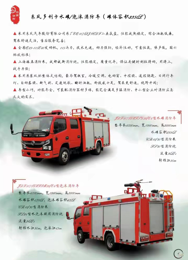 東風(fēng)2.5T型泡沫消防車、水罐消防車,采用東風(fēng)EQ1075DJ3CDF底盤改裝而成。整車由消防員乘員室和車身兩大部分組成,乘員室為雙排,可乘坐2+3人,該車為外露罐結(jié)構(gòu),車身前部為器材箱,中部為水罐,后部為泵房。載液罐體為優(yōu)質(zhì)碳鋼,與底盤采用彈性連接,載水1700kg(PM20)/2350kg(SG20),泡沫液量650kg(PM20),裝備了上海雄真消防設(shè)備有限公司生產(chǎn)CB10/20型低壓消防泵,額定流量20L/S,車頂安裝成都威斯特消防機(jī)械有限公司生產(chǎn)的PL24(PM20)或PS20W(SG20)型車用消防炮。。該車輛結(jié)構(gòu)緊湊,配置完備,機(jī)動(dòng)性強(qiáng),能夠及時(shí)應(yīng)對(duì)企業(yè),社區(qū)或重點(diǎn)消防單位的火情,可以第一時(shí)間形成小型戰(zhàn)斗力進(jìn)行初期火災(zāi)的撲救和人員疏散撤離?蓮V泛應(yīng)用于消防救援站,政府專職消防隊(duì),企業(yè)專職消防隊(duì)等。