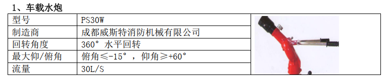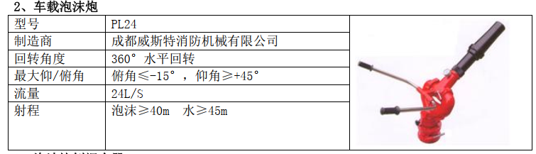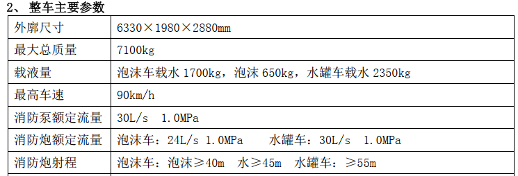泡沫車:24L/s 1.0MPa 水罐車:30L/s 1.0MPa