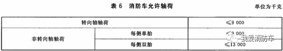 GB7956.1-2014《消防車第1部分:通用技術(shù)條件》表6對消防車允許的軸荷做了規(guī)定,如下圖。