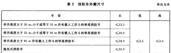 消防車的外廓尺寸應(yīng)符合GB7956.1-3014《消防車 1部分:通用技術(shù)條件》表5的規(guī)定,如下圖。