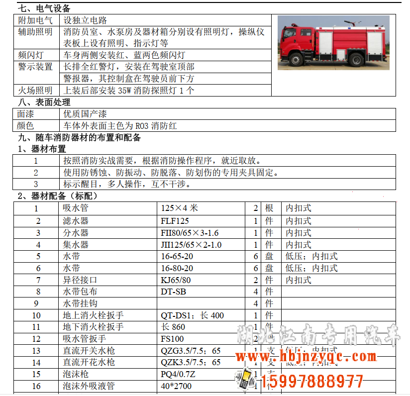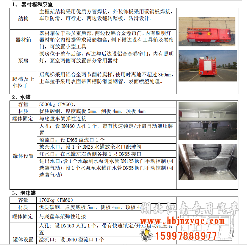 整車說明: 罐體總?cè)莘e:7.200立方米,水罐容積:5.500立方米,水罐尺寸:1880×2440×1250mm,泡沫液罐容積:1.700立方米,泡沫液罐尺寸:1130×1250×1250mm。整體式側(cè)防護結(jié)構(gòu),后防護裝置材料:Q235,截面尺寸:120×120mm,與車輛連接方式:螺栓連接,后防護離地高度:435mm。ABS及控制器型號為:APG3550500H1,生產(chǎn)廠家為:浙江亞太機電股份有限公司;ABS控制器型號:ABS8.8 ECU 24V,生產(chǎn)廠家為:東科克諾爾商用車制動系統(tǒng)(十堰)有限公司。主要專用裝置有消防泵、消防炮。